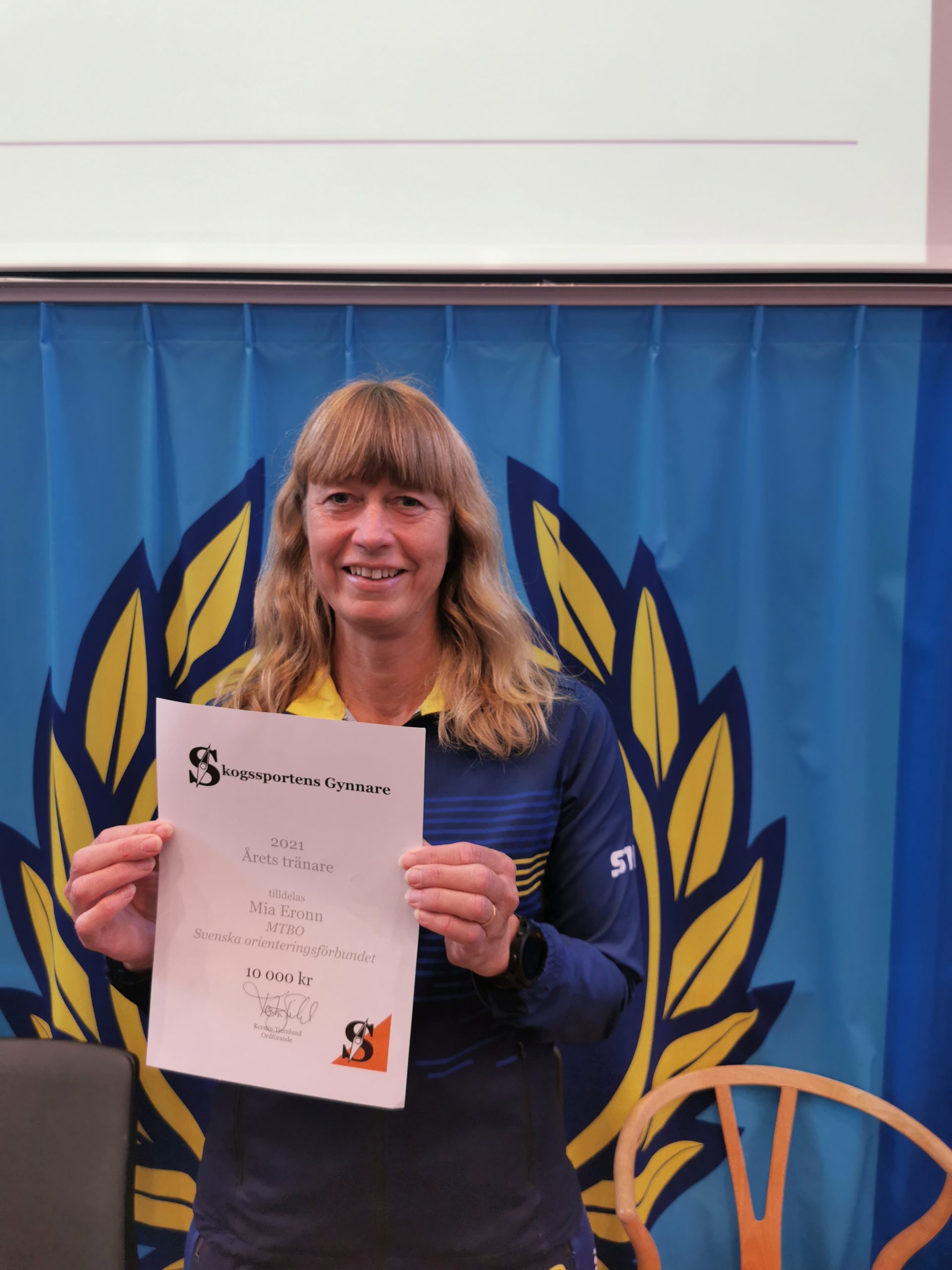 Mia Eronn är sedan knappt två år förbundskapten för MTBO-landslaget. Det har blivit flera mästerskapsmedaljer under året. “För att utveckla mountainbikeorienteringen i stort handlar det om att det måste bli fler som håller på med sporten” säger Mia. Hon har själv arbetat för att bredda toppen i disciplinen och har aktivt bjudit in till flera läger, där hon bl a har utvecklat teknikövningarna. Mia har blivit utsedd till årets kvinnliga tränare 2021.